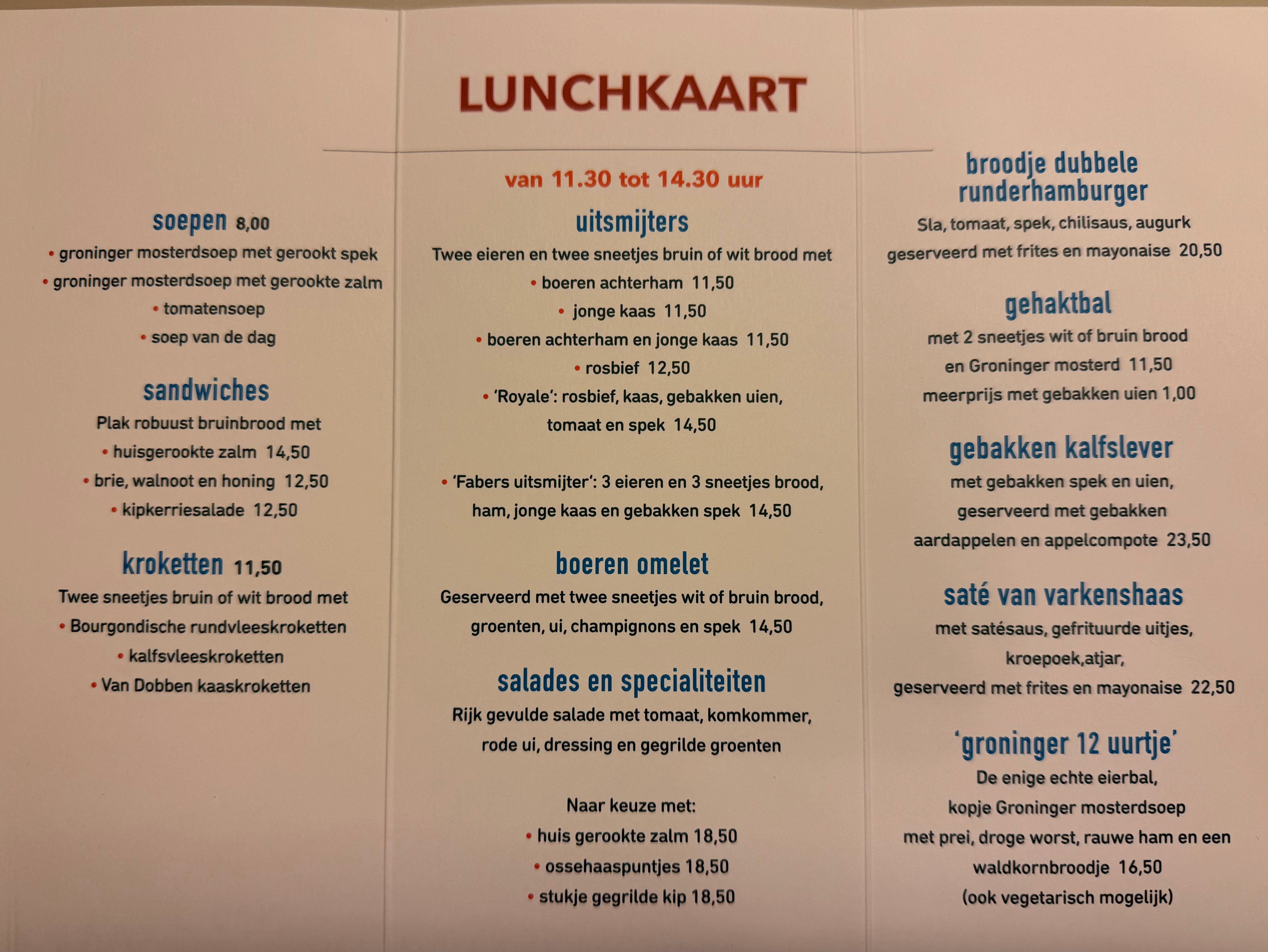 - De gerechten van de Lunchkaart worden geserveerd van 11:30 uur tot 14:30 uur (maandag t/m vrijdag)